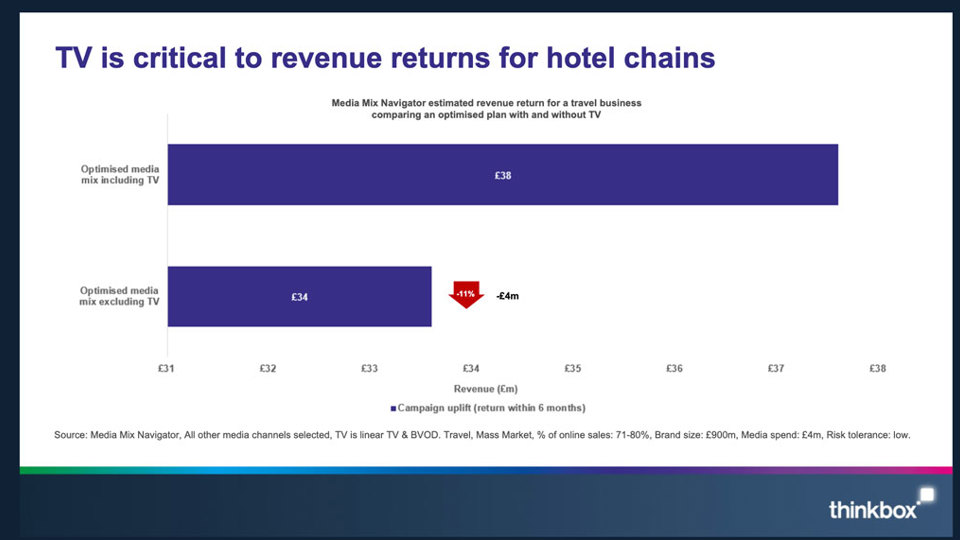 Using travel agents as an example, those not including TV in their media mix saw their returns fall by 18%, which equated to £9m. Similarly for the return for hotel chains not utilising TV saw a £4m or 11% drop.
